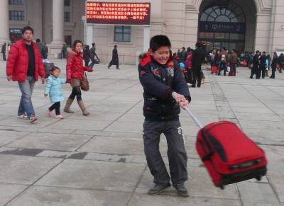 2月7日上午7点50分,这位9岁的男孩,在湖北省武汉市汉口火车站广场上等到温州列车时,趁父亲买过早食品之际,高兴玩起了自带的行李箱,围圈转不亦乐乎,欢乐在旅途。
