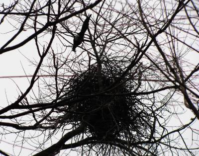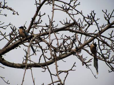 2011年2月7日,湖北省十堰市郧县刘洞镇一农户房前梨树枝头上,两只喜鹊正鸣叫。立春过后,气温回升,部分鸟类飞出丛林,在农户院落鸣叫、觅食、嬉戏,为人类带来了春的气息。