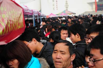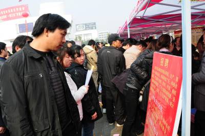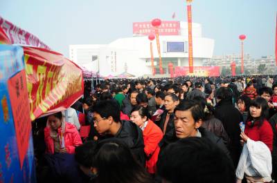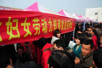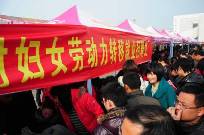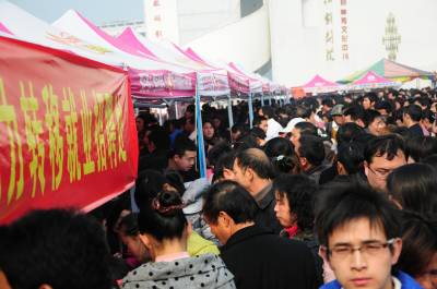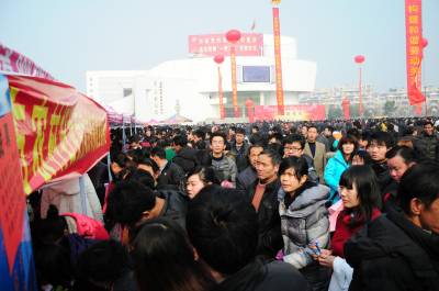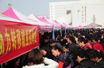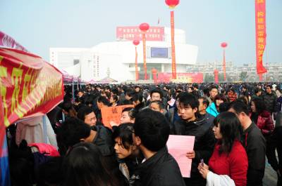 这是2月8日拍摄的黄梅县”春风行动”暨就业招聘活动启动仪式现场。当天,以”服务招商引资,促进就近就业”为主题的黄冈市2011年”春风行动”暨就业招聘活动启动仪式在黄梅县举行,黄梅县近百家企业提供近万个就业岗位,吸引2万多人到现场咨询应聘。(本报视界网王政摄)