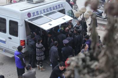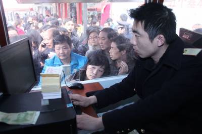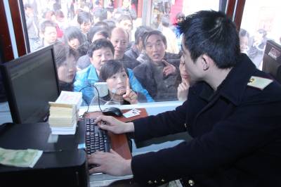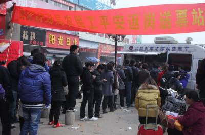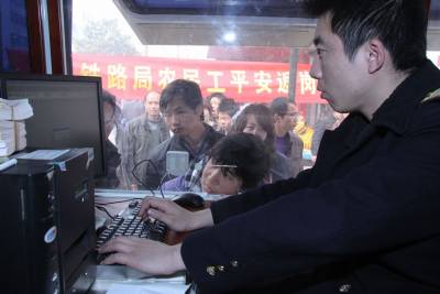 农民工足不出户购票2月8日,在湖北省天门市渔薪镇,包村乡镇干部在移动售票车前为农民工购买火车票。据天门市劳动和社会保障局工作人员介绍,该市约有25万农民工在节后返岗。为缓解农民工购票难,武汉铁路局武昌车站从2月8日至10日组织工作人员深入天门市各乡镇为农民工送票,当地25万节后返岗农民工足不出户就能领到车票。(本报视界网刘银斌摄)