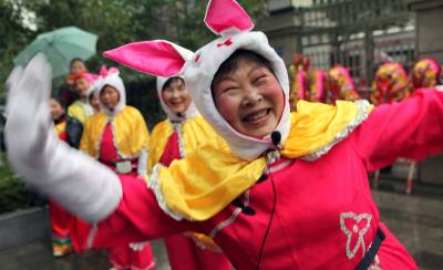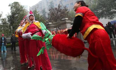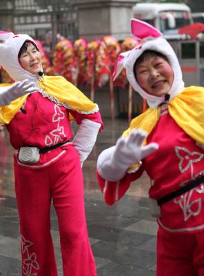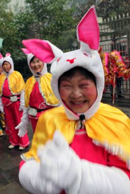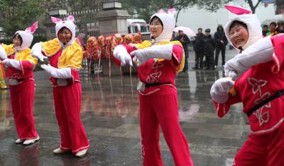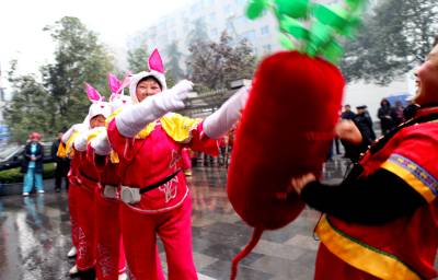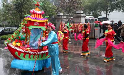 2月9日(农历正月初七),湖北省长阳土家族自治县农民载歌载舞自发进城大拜年。当日,小雨淅沥,10余支农民艺术团冒雨为城区市民表演舞狮、龙灯和彩莲船、三句半等民俗文艺节目,共迎兔年新春。这种大拜年活动一直要持续到正月十五。(通讯员杜强)