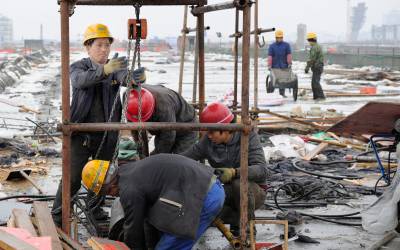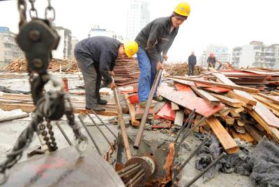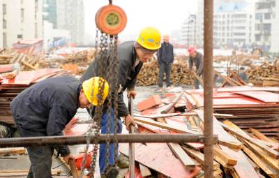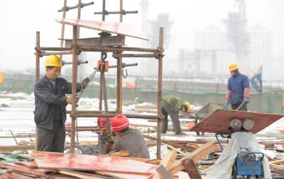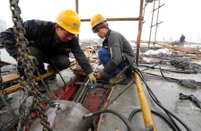 9日,武汉大道黄浦路路段建设工地,工人罗世青(左)和工友在高架桥桥面进行预应力张拉施工。武汉大道是武汉市重点城建工程,春节期间工人加班赶建竹叶山转盘的两条匝道。预计5月底6月初,将实现黄浦路——发展大道通车,整个武汉大道9月贯通。(记者柯皓摄)(最后2张中间工人是熊昆柱)