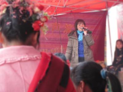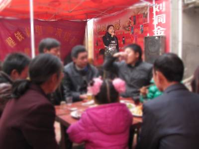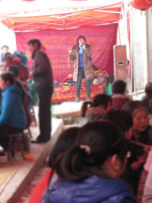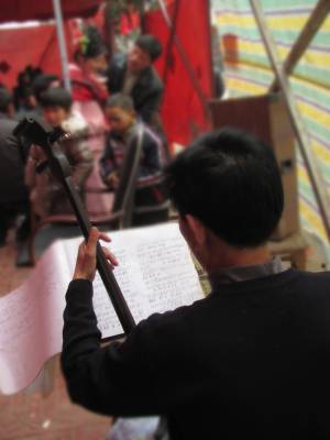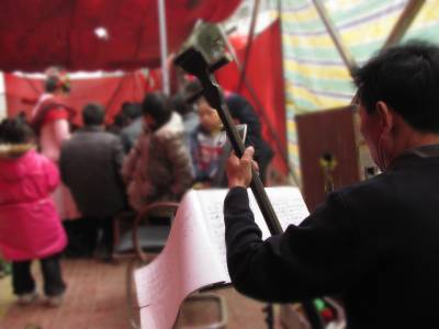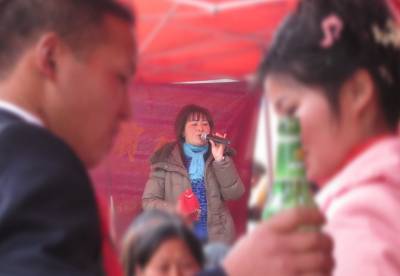 2011年2月8日,一名演唱队队员在湖北省十堰市郧县刘洞镇一农户婚宴上演唱戏曲。近几年,刘洞镇农户每逢红白喜事都时兴请演唱队前来演唱。目前该镇民间演唱队已达25支,他们经常利用红白喜事、传统节假日,带着打击乐器和管弦乐器到乡间演唱,充实山乡文化生活,营造山乡热闹气氛,深受当地村民的欢迎。