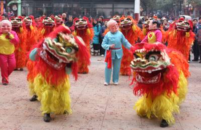 龙腾狮跃闹新春(随州)2011年2月10日2月10日农历正月初八,随州市街头,市民在观看龙狮表演。当日,随州市民间民俗表演团队自发走上街头、进社区、到企业表演龙狮等当地民俗传统文艺活动,向市民送上新春美好祝福。本报视界网杨文明摄