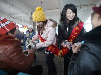 10(昨)日,荆门市东宝区泉口社区阳光志愿者在荆门火车站候车厅为旅客到开水。春运期间,该社区阳光志愿者协助工作人员进行检票、引导旅客进站乘车、回答旅客问询等服务。(本报视界网宁新生摄)