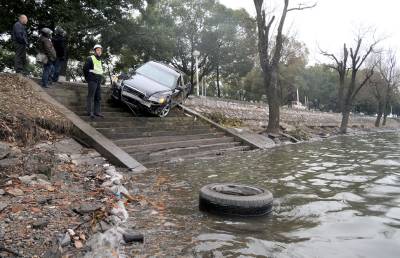 汽车超速引祸端2月10日下午3时,黄石市杭州路发生一起小汽车追尾事故。一辆崭新的黑色奥迪车撞上同向行驶的别克小汽车,将别克车的尾部撞得严重变形后冲到了马路对面的湖边,险些掉入湖中。幸运的是,事故只造成一名男子受轻伤。现场一名目击者说,其中一名驾驶员身上有酒气,疑为酒后驾驶。目前事故原因正在调查之中。图一:黑色奥迪车险些掉入湖中。图二:两辆事故车再次相遇。黄石市黄石日报摄影部邱孝威摄电话:13807232603邮编:4356002