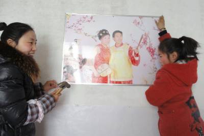 2月11日,郧县刘洞镇九年一贯制学校的徐秋芬老师和女儿正在钉挂刚取回的”结婚照”。该校共有7对结婚已十多年的夫妇在今年的情人节到来之际相约补照了大幅的”结婚照”,弥补了没有结婚照的遗憾,为老年留下美好的记忆。(高超/摄)