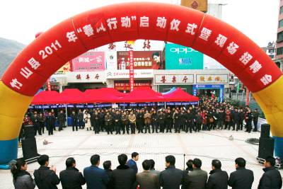 2月11日,竹山县农村劳动力转移就业”春风行动”正式启动。来自浙江、安徽、江苏、福建及县市内的60多家用人单位,齐集该县车站广场,对前来谋职者进行现场招聘。当日上午,前来应聘者达10000余人。几年来,竹山县委政府牢固树立”就业优先”理念,大力拓宽就业市场,去年全县劳务输出10.69万人,创劳务收入7.97亿元,被国家人社部授予”全国农村劳动力转移就业示范县”称号。