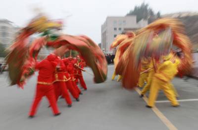 2011年2月11日上午,湖北省十堰市郧县龙灯表演队正表演《双龙戏珠》。当天郧县带着锣鼓队、龙灯队、舞狮队、秧歌队等十余支文艺表演队赴十堰市城区开展新春大拜年活动。本次活动以”市县对接、科学发展”为主题,为广大市民送上了一道文化大餐。(湖北郧县新闻宣传中心曹忠宏摄)