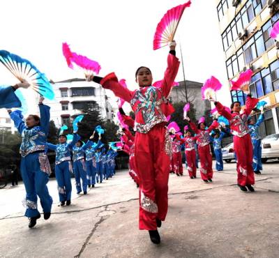 2月11日,一女青年扭起欢快地秧歌向市民拜年。当日,郧县组成7支、480余人的秧歌、彩车等花灯队,赴十堰城区开展新春大拜年活动。通过花灯表演,向全市人民拜年,讴歌该县近年来在全市人民大力支持下经济和社会各项事业取得翻天覆地的新变化,充分展示”市县对接”发展新成果。(本报视界网吴成林摄)