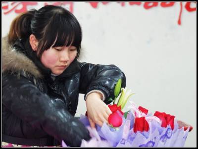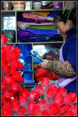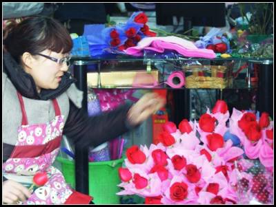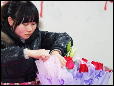2011年2月13日,湖北省宜昌市夷陵区一花店里营业员正在制作玫瑰花束。情人节到了,当地许多市民纷纷提前预订鲜花,鲜花店生意开始红火起来,各式各样的玫瑰,为”情人节”营造了浪漫气氛。