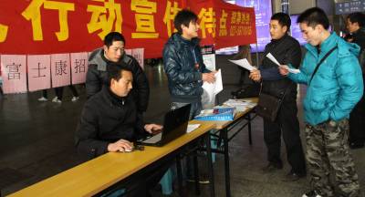 2011年2月13日,武汉武昌火车站,富士康武汉科技工业园工作人员支起了招聘摊位,并安排专车免费送应聘着到厂区面试。据了解,富士康武汉园区春节后多条新的台式电脑生产线和首批游戏机生产线启用,至少要招3万新员工。为了应对务工人员大量外流,湖北省本地企业招工难的状况,武汉富士康在武昌火车站、汉口火车站等交通枢纽现场招聘员工,同时接受预约应聘;春节一过,富士康就派出招募专员分赴湖北省各地州市人才市场招聘;富士康园区招募中心从正月初六开始常年对外招聘。外地人员应聘抵达武汉后,富士康安排专车接应聘者直达园区,并报销单趟来汉火(汽)车票;富士康武汉园区新进员工试用期及考核期月收入可达2200元,考核期满后最高可达2800元,并为员工提供免费工作餐、免费洗衣、节日礼金、免费上网等福利,宿舍有空调和洗澡热水供应。春节过后,全国部分地区企业迎来招工高峰。