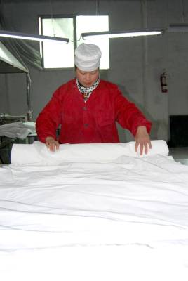 2月14日,位于宣恩县城的鑫宜纺织品公司组织员工对购进的原材料纱线通过高速整理经线、卷纬线(图一)、上织布机,生产出白色坯布(图二),然后对坯布修织(图三)、完善,以便打包、销售。鑫宜纺织品公司分管生产的负责人谭文学介绍说,公司由于生产环境欠佳,员工待遇没有沿海发达地区同行业高等主要原因,导致企业2008年以来一直未能满负荷生产,2010年产销坯布292万米,如果满负荷年可产销坯布480万米。(签约摄影师汪盛华)