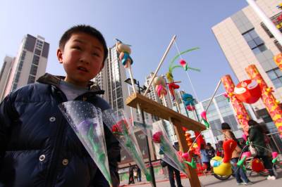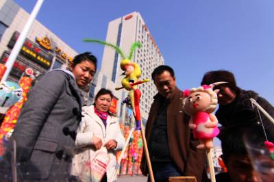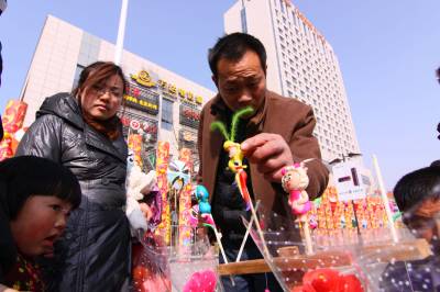 2011年2月13日,湖北省襄阳市,一名民间艺人捏地面人吸引了市民观看。传统民俗仍然受到群众的喜爱。