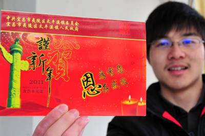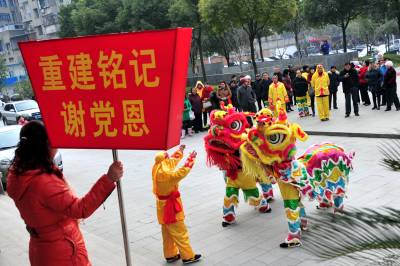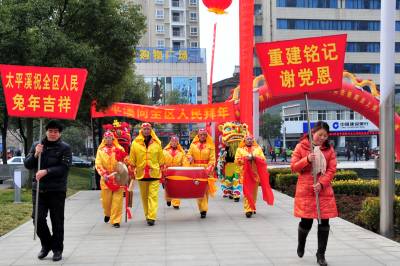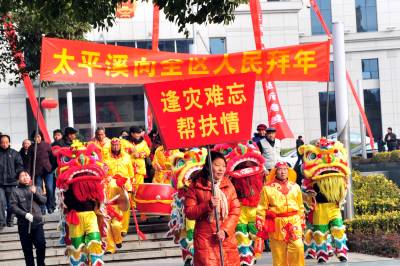 2011年2月14日,三峡坝头库首第一镇——湖北省宜昌市夷陵区太平溪镇农村民俗乐队来到城区小溪塔,为支援他们去年遭受”7.23”特大暴雨灾害后,伸出援助之手的社会各界拜年,送去新春美好的祝福,向各级党委、政府以及所有关心、援助灾区建设的同胞表达他们最真挚的感恩之情。 2010年7月23日晚,三峡坝库区遭受特大暴雨袭击,导致山洪发生,造成太平溪镇351户倒房,1.2万多人受灾,直接经济损失1.2亿元。在社会各界的帮扶下,这些倒房户在春节前已全部搬进新居。报视界网张国荣摄