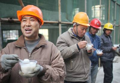 14日,在荆门市城区一建筑工地做工的朱祥银高兴地吃着热腾腾的汤圆。元宵节临近,东宝区泉口社区在辖区建筑工地开展”喜迎元宵佳节,真情关爱农民工”活动,将热腾腾的汤圆送到建筑工地,让不能与家人团聚的农民工感受到浓浓的亲情。(本报视界网宁新生摄)