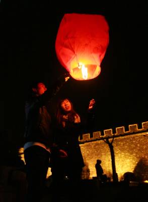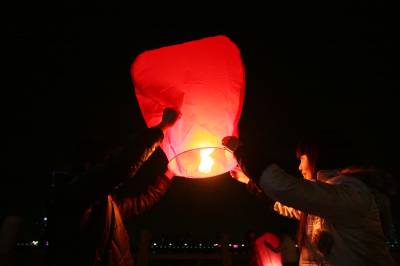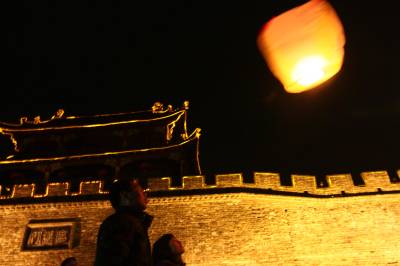 2011年2月14日,湖北省襄阳市,一对情侣在放飞许愿灯。如今西方情人节在我国年轻人中更被赋予了传统的中国味道。