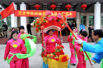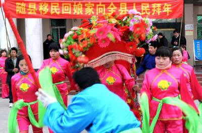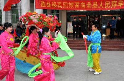 ”郧县移民迁随县,当地政府很关心,生活生产都很好,家乡人民请放心。”2月15日一大早,郧县移民徐朝成激情澎湃地唱着对家乡父老乡亲们说。当日,郧县柳陂镇辽瓦村迁往随县新街镇的24名移民敲锣打鼓,划着彩船,欢天喜地地扭着秧歌在柳陂镇、郧县城展开回娘家新春大拜年活动,以此来表达对家乡人民新春祝福。2010年,郧县圆满完成了南水北调中线工程31488名移民外迁工作,今年又将完成28000人的移民后靠内安工作。本报视界网程复华赵锋摄442500郧县国税局