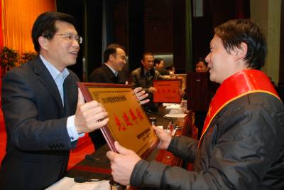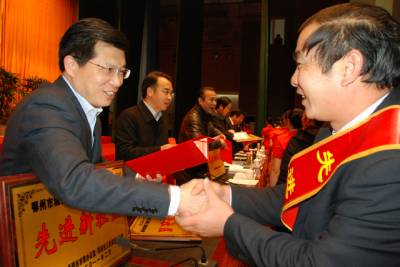 16日,鄂州市市长陶宏(左一)给获奖者颁奖。当日,鄂州市在会议中心召开全市农村工作会议,表彰一批先进个人及单位。2009年4月,鄂州市启动城乡一体化试点工作,强力推进农村新社区建设。截止目前,全市在建和基本建成的新社区有43个,吸引省内外200多批次6000余名客人前来参观学习,城乡一体化建设成效显著。(本报视界网赵毅摄)