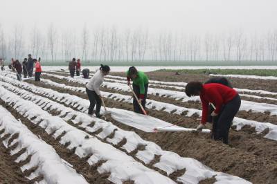 16日,天门市拖市镇各安置点的移民在该镇梅河村进行马铃薯育苗、铺膜。由全国粮食生产大户宋宏林组织的宏远马铃薯合作社在今年的生产中,全部聘请移民,并安排技术人员手把手教他们种植马铃薯,使移民既能打工赚钱又能尽快熟悉当地农业生产环境。连日来,移民已为宏远马铃薯合作社种植马铃薯12000亩,打响了拖市镇春耕生产第一炮。(本报视界网肖金舫摄)