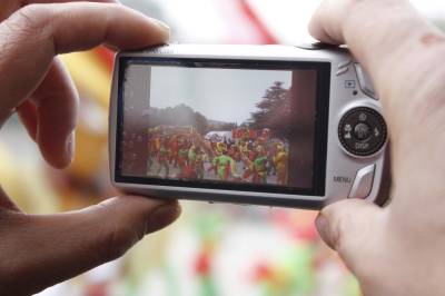 2月17日,沙洋县组织舞龙、彩莲船等多支民俗表演队为城乡群众送上远宵”大礼”。图为一群众在拍摄舞龙表演。