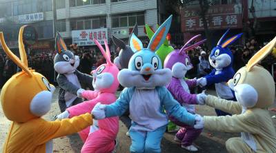 2月17日,一群可爱的兔子正在闹元宵。当日上午,南漳县举行大型闹元宵活动。来自全县的民间文艺代表队的舞龙、舞狮、旱船等民间表演把10里长街闹得喜气洋洋。他们用美好的心情共祝兔年的元宵节。