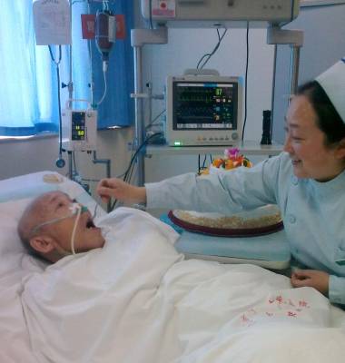 2月17日,在市中心医院ICU的病房里,护士长刘静兰给文爷爷喂生日蛋糕,这天是元宵节,恰巧又是文爷爷80岁的生日,医护人员为他举办了特殊的生日Party。文爷爷8个月前因多种疾病住进该院ICU,8个月来ICU医护人员用精湛的医术和精心的护理创造了一次又一次生命的奇迹。
