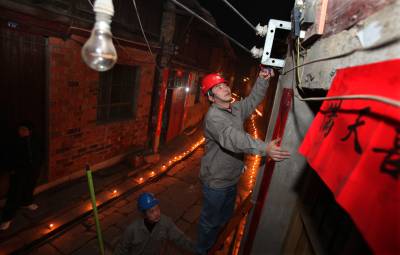 2月17日,元宵节晚,湖北咸宁供电公司抢修队员刘太明和同事正在赤壁羊楼洞古街,给突然停电的一家居民抢修电源。”三十的火,十五的灯。”为让元宵节晚上每家灯点亮,讨个吉利。咸宁供电公司加大抢修力度,组织精兵强将24小时值班,第一时间赶往故障点,快速地修好故障,为用户及时恢复供电。