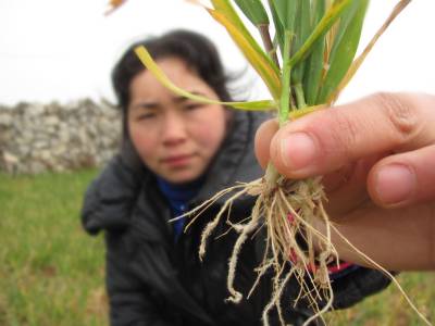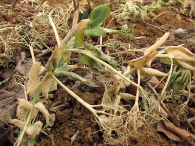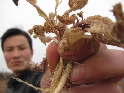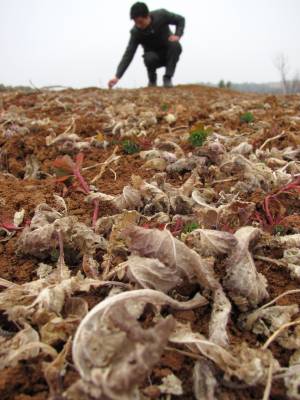 2011年2月18日,湖北省十堰市郧县刘洞镇杨河村村民正查看枯萎的油菜。14日,从十堰市防汛抗旱指挥部获悉,由于十堰市降水持续偏少,出现了秋冬连旱,自去年10月以来,十堰降水量与历史同期相比偏少6到7成。目前各类农作物和经济作物受旱面积超过100万亩,2.8万人缺水,1.1万头大牲畜饮水困难。