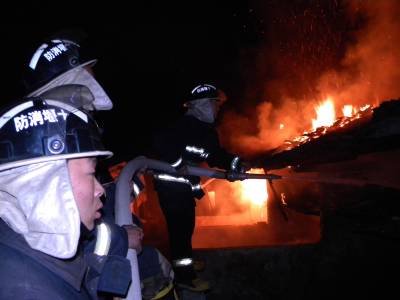 图文:元宵夜100多头生猪险成”烤猪”17日晚20时许,房县建设路东昌小区旁一农家养猪场元宵节夜里突发火灾,圈养着100多头生猪的养猪场顷刻之间被笼罩在火海里,随时面临被熏成”烤猪”的威胁。养猪场为一层砖木结构房屋,总共有四间,屋顶距离地面仅2米左右,着火部位是养猪场上方堆放着稻草的木制屋顶。由于天空正刮着微风,大火迅速熊熊燃烧,火势上窜至10米多高,消防官兵站在3多米远的地方面部就能感到灼烧感。着火点下边的猪圈里圈养着100多头大小不一的生猪被大火烤得嗷嗷直叫,来回到处乱窜。此时,整个房顶都被大火笼罩,火势处于猛烈燃烧阶段,火光冲天,如不及时扑救,形势十分危险。查明情况后,现场消防指挥员当机立断,将参战官兵分成三组:第一小组3名队员迅速架起一支水枪从上方强行压制熊熊燃烧的大火;第二小组3名队员架起一支水枪在下方阻止火势蔓延,并不停的往生猪身上喷水进行降温;第三小组3名队员负责现场警戒,并同场主一道将圈里的生猪逐个轰赶到安全地带。消防官兵在夜幕下轮番上阵,顽强扑救,经过30多分钟的顽强扑救,终于成功将火势控制。消防官兵乘胜追击,继续将余火一点点扑灭,到当晚21时10分左右,成功将大火扑灭,养猪场100多头生猪安然无恙。据了解,此次火灾原因初步认定为正逢正月十五闹元宵,当地人们夜晚燃放烟花爆竹助兴,但一不留神引发火灾。(本报视界网徐雁初、徐兵摄)