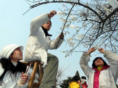 2月20日下午,来自华中农业大学园艺林学学院园林植物与观赏园艺的9位博硕士,在湖北武汉东湖梅园里,对梅花品种的雪梅树进行人工授粉和进行防外粉侵袭的保护科研实验,吸引了许多游客的关注和咨询,他们边做实验,边向游人宣传梅花的科普常识