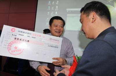 2月21日,湖北珍珠液酒酿造公司董事长、总经理王建智(左)将12万元支票奖给销售功臣李应波。当日,湖北珍珠液酒酿造公司拿出百万元资金奖励2010年度先进单位、先进个人、劳动模范、优秀共产党员、文明家庭和销售能手。据悉,该公司2010年累计完成工业总产值9000万元,实现销售收入8311万元,上交税金364万元,同比分别增长149%、37%和63%。