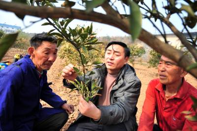 连日来,在湖北省宜昌市夷陵区鸦鹊岭镇等柑橘主产区的橘园里,农技人员针对橘树遭受冰冻灾害后的管理,现场指导橘农们修剪树枝、喷洒农药,掀起了柑橘春季管理热潮。据悉,柑橘是宜昌市夷陵区农业支柱产业之一,柑橘面积达到35万亩、产量45万吨,成为当地农民收入的主要来源之一。本报视界网张国荣摄
