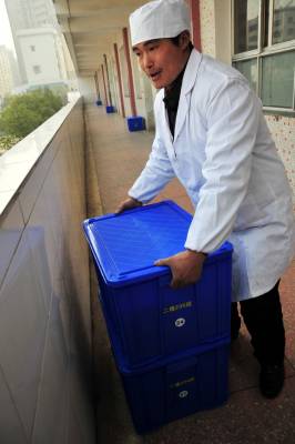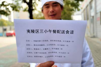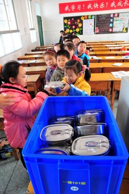 2011年2月24日,湖北省宜昌市夷陵区通过整合东湖高中的餐饮资源,开办的城区学校”大食堂”正式开始为学生配送午餐,学生的午餐难问题得到有效解决。 据悉,宜昌市夷陵区”大食堂”配餐采取学生自愿订餐原则,每个班推选2名学生家长为配餐监督员。”大食堂”在菜肴的采购、制作、运送等环节严格把关,餐具实行统一管理,确保饮食安全。该区第三完全小学作是”大食堂”配送午餐的第一所试点学校,计划今年秋季学期城区学校将全部实行午餐配送。本报视界网张国荣摄