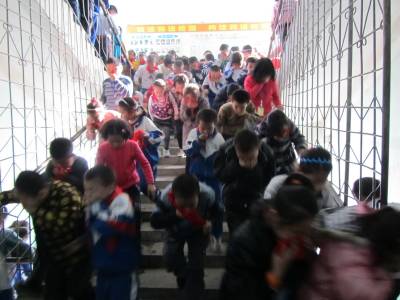 2月24日上午,钟祥市长滩金星小学400余名学生在教室的组织引导下举行了”火场”逃生演练。图为该校学生从”火场”——各班教室紧急向楼下疏散。