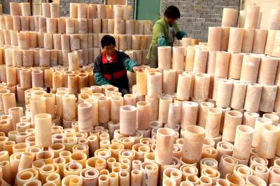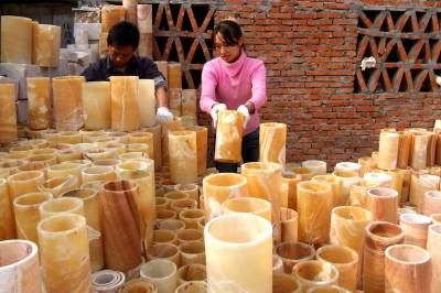 1日,郧县谭山镇东岳村村民们正在加紧生产米黄玉石材工艺品出口订单产品。素有”中国米黄玉之乡”的郧县谭山镇,米黄玉大理石资源丰富,全镇292家大理石加工厂家走规模化精深加工之路,生产出龙凤玉枕、玉杯、工艺雕刻和家私等20余个系列米黄玉工艺品种。开年以来,来自法国、新加坡、泰国、港澳台及国内20多个国家和地区的”石头”订单飘洋过海纷至沓来,米黄玉石材工艺品产销两旺,供不应求。程复华摄442500郧县国税局