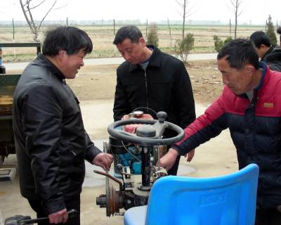 2月28日,黄梅县农机局技术员(左)在濯港镇丁字街村为农机户免费检修农机(如图)。入春以来,该县选派经验丰富、事业心强的农机技术员进村入户,或宣传农机知识,或帮助指导农民机手调试和检修各类农机具,为春耕生产打好基础。(本报视界网吴志雄摄)