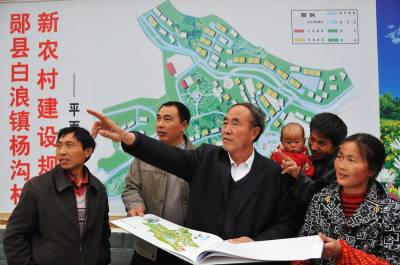 湖北省郧县白浪乡杨沟村党支部多年来带领全村从事种植业致了富,并科学规划村民建设新楼房,将分散居住的30户贫困家庭迁移出环境恶劣的环境,在资金上扶持他们住进新楼房,使全村95%的村民家庭住上楼房。2011年该村计划将剩余几户也迁移集中建房,使全村人都住进楼房。图为该村党支部书记杨丰才(中)正与村民们对照规划图纸一起展望2011年迁移家庭集中建房位置时的情景。周家山摄湖北省郧县城管大队电话13872840078邮编442500