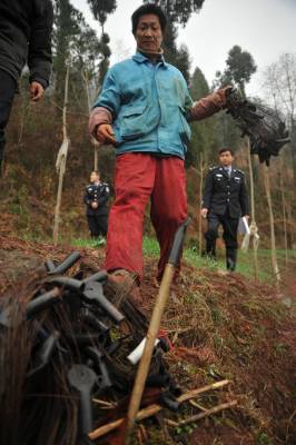连连看:”一扫光”被森林公安一扫光3月2日,巴东县森林公安局正在溪丘湾乡溪丘湾村2组的丛林中勘察非法狩猎现场(图一)。当天,县森林公安局接到举报,称有人在利用一种俗名叫”一扫光”的自制非法狩猎器材从事非法猎活动,公安民警迅速行动逮捕了犯罪嫌疑人陈某,责令陈某现场拆除了捕猎的工具(图二)。随后,公安民警还收缴了一批从事非法狩猎的器材,包括电瓶和猎枪等,还根据陈某的供述及时截获了一批已被宰杀的珍贵野生动物(图三)。据介绍,陈某自制的”一扫光”捕猎器材电网长达500米远,最高电压可达25万伏,动物触碰即瞬间毙命。记者手记:非法狩猎致人死亡的事件层出不穷,对人民群众的生命安全造成了极大隐患,为有效遏制非法狩猎案件的发生,保护国家珍稀野生动物的安全,必须采取积极措施,预防和最大限度地减少非法狩猎现象的发生,对因非法狩猎构成犯罪的要坚决予以刑事处分。记者谭琼辉恩施新影像图片网涂启亮摄