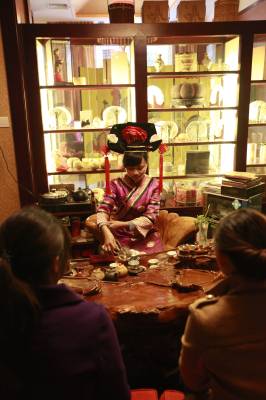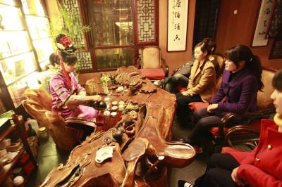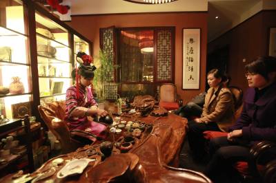 茶艺成新时尚3月2日,一位身穿古装的茶艺师现为顾客场表演茶道。时下,进茶艺馆饮茶,已成为宜昌市民一种新的时尚。这里不仅能品茶,更能欣赏茶艺师带来的精湛的茶道表演。本报视界网黄翔摄