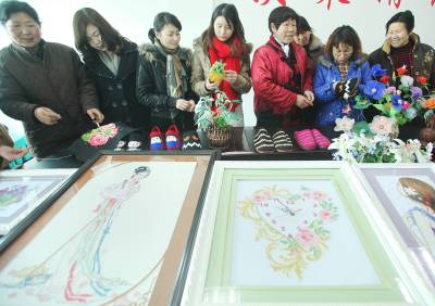 3月3日,荆门市东宝区泉口社区举办”巧手杯”手工作品竞赛,辖区居民争当”巧妇”,纷纷拿出绝活,编织、刺绣、剪纸等60件手工作品,琳琅满目,颇具水准。(本报视界网宁新生摄)