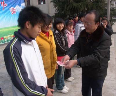 2011年3月3日下午,湖北省谷城县第二中学举办了国家助学金、彩票公益金发放仪式,共为347名学生发放国家助学金、彩票公益金25万元,以帮助学生圆满完成学业。图为该校校长阮承胜正在为学生发放助学金的情景。 通讯员程良辉摄