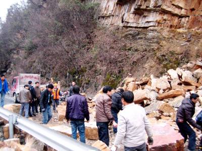 巴东绿葱坡锵家岩岩石垮塌当地道班群众抢险疏通道路恩施晚报特约记者张洪刚摄影报道”我从果子堡转弯过来,听见轰的一声,看见锵家岩垮了岩啦,当时有个面的车刚从岩石下经过,差点儿被埋,万幸没有遇难”,一货车司机心惊肉跳地讲述着当时的情形。2011年2月3日下午五时许,209国道湖北巴东县绿葱坡镇锵家岩段大约一百多立方米岩石从20多米高处垮塌,将道路完全堵住。绿葱坡道路养护公司得知情况后,迅速派人现场查看,面对巨大的岩石,准备联系挖掘机或装载机时,当地的老百姓和司机都围过来自发的吆喝:”大家一起来,把路疏通,还等什么!”二三十人齐上阵,搬的搬,推的推,经过一个小时的苦战,终于疏通了两米多宽的路面,让阻塞的二十多辆车顺利通过。通联:湖北恩施航空路184号(州气象局院内)联系:张洪刚电话:13329820458