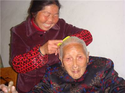浠水县汪岗镇梅梓山村6组老人陈桂花如今已经101岁了,她的儿媳南秀兰30年如一日地照顾她的生活起居,在当地被传为佳话。图为儿媳在为她梳头的情景。视界网签约摄影师:徐桂松