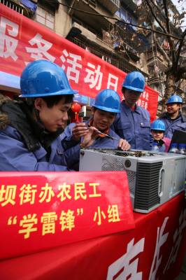 农民工”学雷锋小组”为居民服务3月4日上午,宜昌市西陵区西坝街道农民工”学雷锋”小组的百余名志愿者充分利用自身技能,为社区居民提供家电维修、衣物缝补、修鞋修车、理发等服务。去年四月以来,西坝街办成立了农民工学雷锋小组,3000多农民工业余时间为社区居民服务近万次。视界网刘明强摄