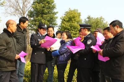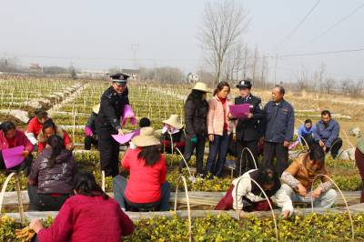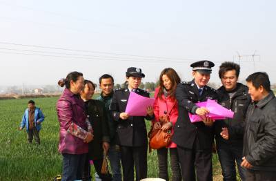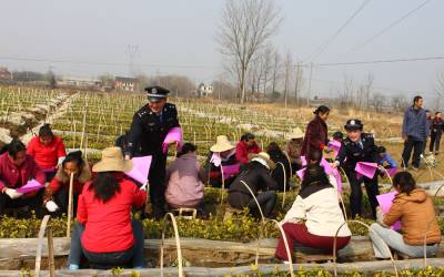 3月4日,湖北省京山县公安局永兴镇派出所两名民警向正在田里劳作的该镇群光村村民们发放春季治安防范宣传单,进行法制宣传。在春耕大忙即将来临之际,京山县公安局永兴镇派出所印发8000余份治安防范宣传资料逐村逐户上门为村民讲解防盗、防抢、防诈骗,拒黄、拒赌博、拒绝毒品,增强村民们的法律意识,守法、守纪、守规矩等法律知识。通讯员李凯谢征宇摄