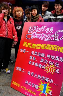 6日,宣恩县一美容美发店的员工在街头进展针对女性朋友的促销活动。随着”三八”国际劳动妇女节临近,宣恩县各商家纷纷展开促销攻势,竭力吸引女性消费者的眼球,针对女性的各种”商战”悄然升温。本报视界网宋文摄