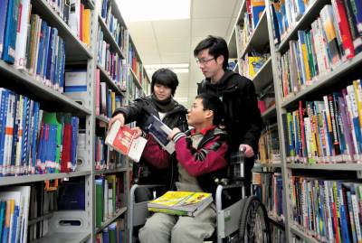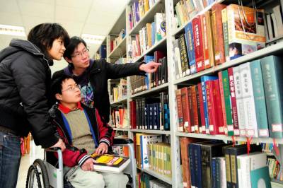 爱心永恒情满校园4日,黄石理工学院国际学院两名青年志愿者陪同残疾同学秦志淋在院图书馆借书。为了扎实推进志愿服务行动,该学院志愿者开展”爱心永恒之象牙塔内外”为主题的志愿服务活动。秦志淋同学腿部残疾,在校就读半年以来,每天重复着宿舍和教室两点一线的生活。为了丰富他的课余生活,国际学院志愿者轮流陪同他在食堂就餐,并参观校园,还带他参观了市博物馆,了解黄石历史变迁与发展。通过志愿者的帮助,让他体会到国际学院大家庭的温暖。黄石市黄石日报摄影部邱孝威摄电话:13807232603邮编:435002