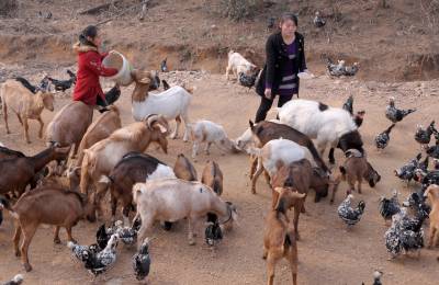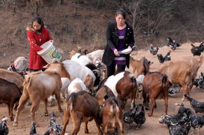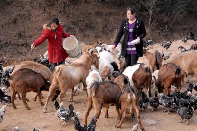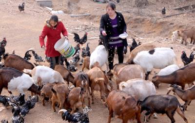 3月7日,二名饲养员在鄂州市沙窝乡宝团村千秀谷生态农业基地喂养英国贵妃鸡和南江山羊。沙窝乡宝团村地处鄂州市东南部的边远山区。今年,该村合理利用丰富林地资源,大力发展生态农业,以珍禽养殖来拓宽农民增收渠道,目前引进了一批英国贵妃鸡,贵妃鸡以其貌美、好养、生长周期短、市场价格高等优点,陪受当地农民喜爱,家禽养殖业已成为沙窝乡宝团村农民增收的新途径。