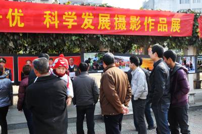 3月6日,湖北省郧县县委组织部,县委宣传部联合主办,郧县摄影家协会承办的”盛事郧阳--郧县创先争优科学发展大型摄影作品展”,在郧阳文化广场举办。展出摄影作品160幅,其中大画幅组照60幅,展出作品吸收许多欢众前来观看。图为观众正在观看摄影作品时的情景。周家山摄湖北省郧县城管大队电话13872840078邮编442500